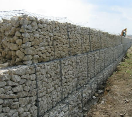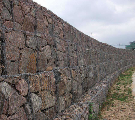 格賓籠是由金屬線材編織的角形網(六角網)制成的網箱。石籠網由高抗腐蝕、高強度、具有延展性的低碳鋼絲或者包覆PVC的以上鋼絲使用機械編織